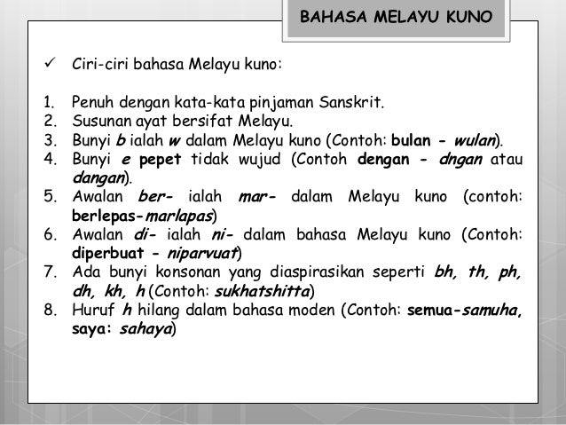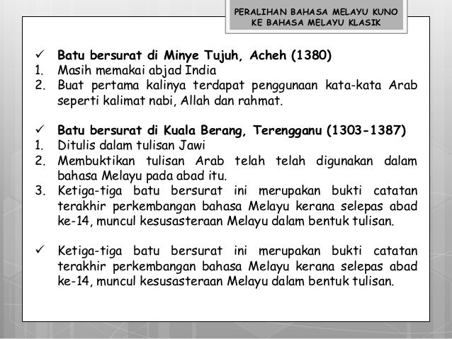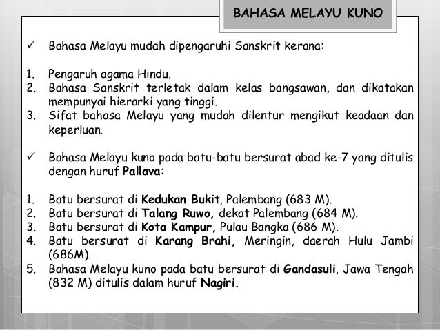 Asal usul bahasa melayu kuno. Sebelum kedatangan pedagang india ke kepulauan melayu bahasa yang digunakan oleh masyarakat setempat dikenali sebagai bahasa melayu purba. Nota ringkas bahasa melayu tingkatan 6 stpm penggal 1 2 3 1. Bahasa melayu kuno ialah bahasa melayu yang berkembang pada akhir abad ketujuh hingga abad ke 13 seiring dengan tempoh kegemilangan kerajaan sriwijaya di asia tenggara. Pada masa inilah bahasa melayu mengalami evolusinya yang pertama.