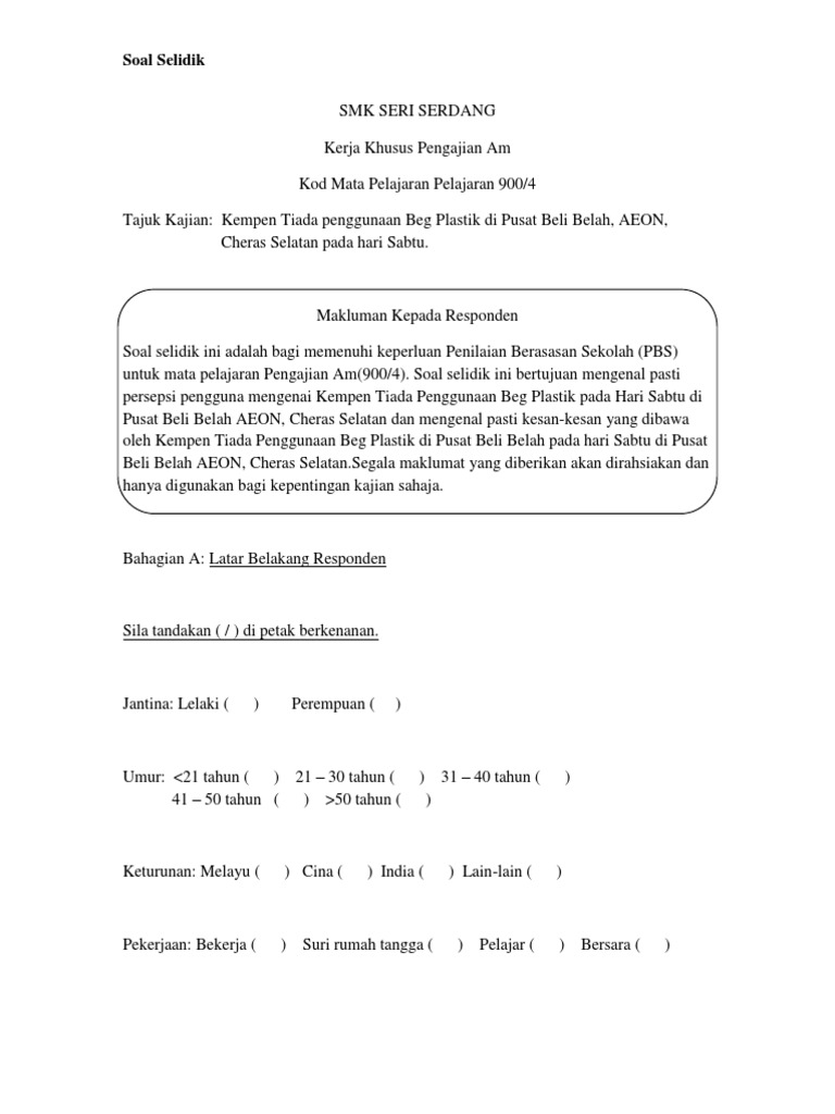 Borang Soal Selidik Docx Kolej Tingkatan Enam Sri Istana Borang Soal Selidik Kerja Kursus Pengajian Am Makluman Kepada Responden Soal Selidik Ini Course Hero