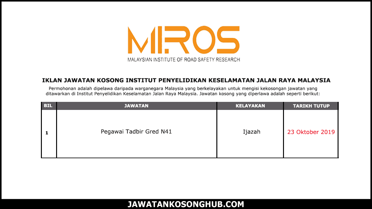 Jawatan Kosong Di Institut Penyelidikan Keselamatan Jalan Raya Malaysia Miros 23 Okt 2019 Kerja Kosong 2020 Jawatan Kosong Kerajaan 2020