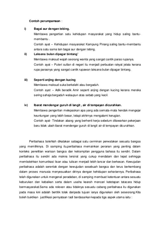 Ayat contoh hatinya bagai dihiris dengan sembilu apabila dituduh mencuri wang itu. Berat sama dipikul ringan sama dijinjing. Bagai aur dengan tebing. Peribahasa bagai aur dengan tebing bermaksud tolong menolong di antara satu sama lain.
