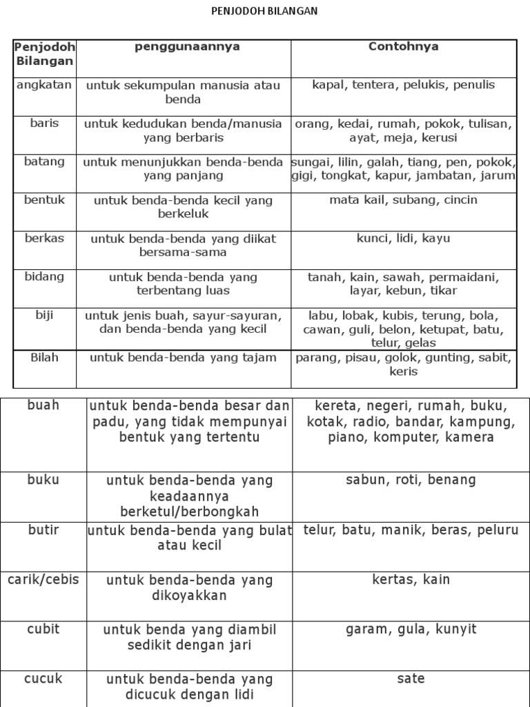 Digunakan untuk benda yang besar dan padu yang tidak menentu. Penjodoh bilangan ialah kata yang digunakan untuk membilang unit benda orang haiwan tempat dan sebagainya. Dalam bahasa melayu penjodoh bilangan ialah kata yang digunakan bersama sama dengan kata bilangan untuk membilang kata nama konkrit bukan abstrak seperti orang haiwan benda tempat dan sebagainya yang berikut ialah senarai penjodoh bilangan yang digunakan dalam bahasa melayu. Untuk bahagian atau sebahagian benda yang masih menyala atau terbakar seperti kayu api rokok.