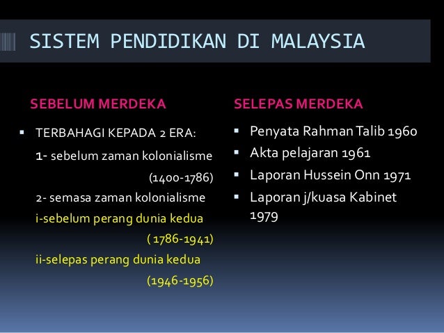Kronologi perkembangan pendidikan di malaysia erra priska michael 1 perkembangan pendidikan di malaysia sebelum merdeka sekolah pondok pendidikan tidak formal pengajaran kitab suci al quran tingkah laku dan akhlak yang baik pengetahuan dan juga sifat kerohanian. Dalam tahun tahun menuju kemerdekaan telah timbul kesedaran di kalangan pemimpin dan rakyat malaysia tentang betapa mustahaknya diadakan satu sistem pendidikan kebangsaan untuk mengganti sistem pendidikan penjajah bagi memenuhi kehendak negara. Masyarakat dan pendidikan haruslah bergerak seiring kerana pendidikanlah yang membentuk acuan seseorang individu tersebut oleh yang demikian penulisan ini akan membincangkan berkenaan sistem pendidikan di malaysia yang telah mengalami perubahan dari zaman sebelum merdeka sehingga ke hari ini hal ini demikian kerana sistem dan dasar pendidikan di malaysia sering mengalami perubahan terutamanya. Oleh yang demikian penulisan ini akan membincangkan berkenaan sistem pendidikan di malaysia yang telah mengalami perubahan dari zaman sebelum merdeka sehingga ke hari ini hal ini demikian kerana sistem dan dasar pendidikan di malaysia sering mengalami perubahan terutamanya laporan laporan pendidikan yang telah dikeluarkan selain itu penulisan ini juga akan melakukan satu analisis terhadap.