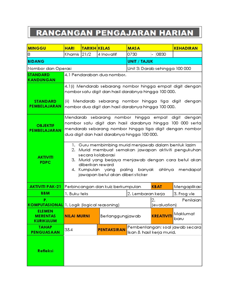 Templat Rancangan Pengajaran Harian Rph Pembelajaran Abad Ke 21 Pak 21