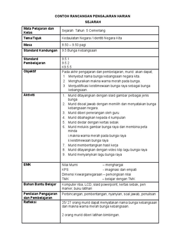 Contoh Rph Sejarah Tahun 5