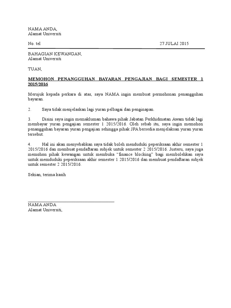Contoh surat tangguh lapor diri jawatan baru june 25 may 47 april 30 march 6 january 20 2012 77 december 18. Contoh surat rayuan penangguhan bayaran yuran semester. Contoh surat tangguh pengajian semester. Kad pengenalan 830109 12 0000 merupakan pelajar universiti malaysia sabah program ijazah sarjana pendidikan pendidikan jasmani dan kesihatan tahun 2016 2017 kemasukan mac ingin memohon untuk penangguhan pengajian ijazah pada semester ini.