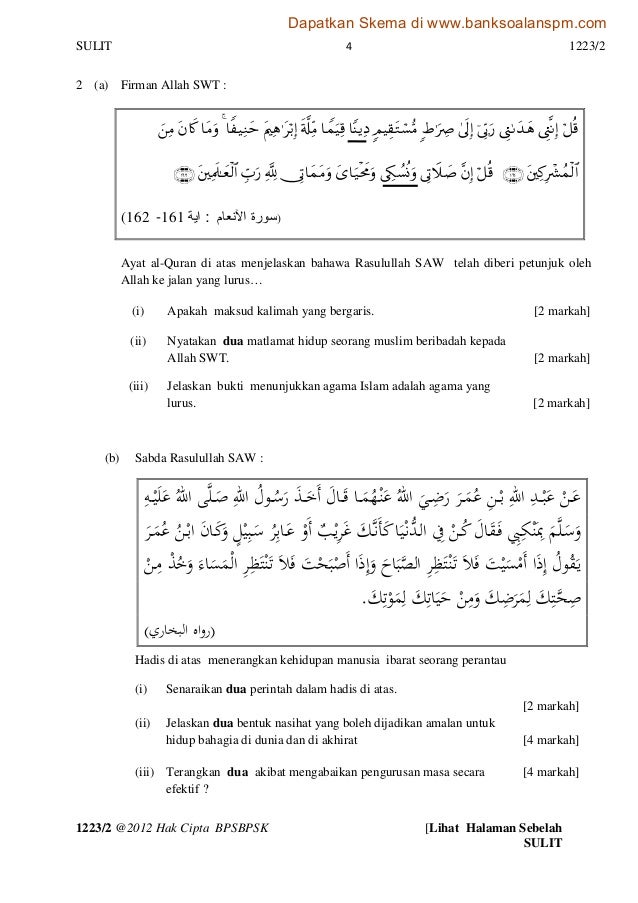 Juga supaya anak anak anda memahami tanggung jawab mereka terhadap anda sebagai ibu bapa dapatkan segera nota gemilang pendidikan islam spm buku rujukan nota pendidikan islam spm yang sangat sesuai untuk calon calon spm dapatkan juga modul gemilang pendidikan islam ting 4 dan modul gemilang pendidikan islam ting 5 buku kerja yang akan menjadikan pdpc anda lebih mudah. Soalan 1 dan 2 wajib. 1 kertas 2 soalan no. Sulit 1223 2 1223 2 2012 hak cipta bpsbpsk lihat halaman sebelah sulit pendidikan islam kertas 2 ogos 2012 1 2 3 jam bahagian pengurusan sekolah berasrama penuh dan sekolah kecemerlangan kementerian pelajaran malaysia pentaksiran diagnostik akademik sbp 2012 percubaan sijil pelajaran malaysia pendidikan islam kertas 2 satu jam empat puluh minit jangan buka kertas soalan ini sehingga.